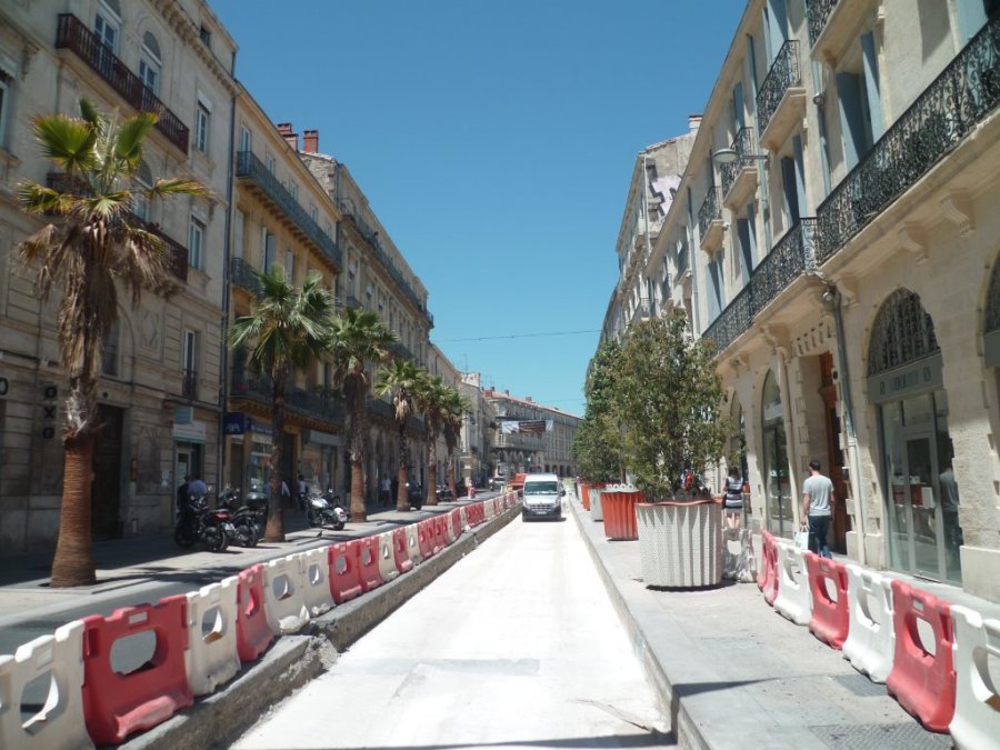 Boulevard du Jeu-de-Paume à Montpellier, entre la rue André-Michel et la rue Marceau, la dalle de béton sur tapis anti-vibratile de la plateforme de la future voie montante de la ligne 4, réalisée il y plus de deux ans déjà, a été mise à jour. Photo prise le vendredi 5 juin 2015. Copyright : Edouard Paris