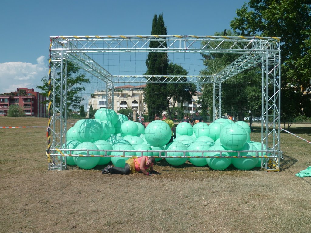 Obstacle de la cage aux ballons sur la presqu’île du bassin de Port Ariane à Lattes, une des nouveautés de l’édition 2015 de la ruée des fadas, le dimanche 7 juin 2015. Copyright : Edouard Paris