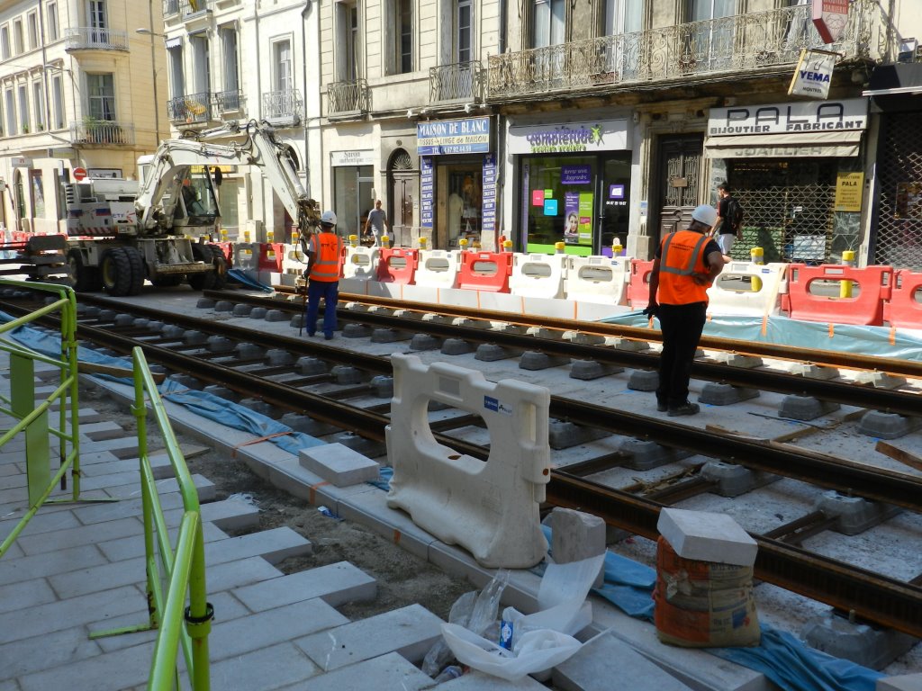 Boulevard du Jeu-de-Paume à Montpellier, pose des voies entre la rue du Faubourg-du-Courreau et la rue Marceau, le jeudi 11 juin 2015. Copyright : Anje34