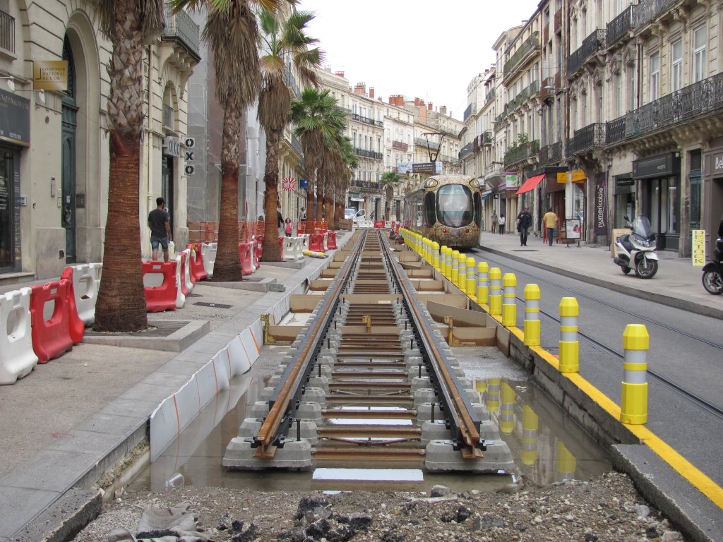 Boulevard du Jeu-de-Paume à Montpellier, voie descendante de la ligne 4 de tramway posée et rails soudés, entre la rue André-Michel et le bas du boulevard précité. Photo prise le samedi 13 juin 2015. Copyright : Edouard Paris