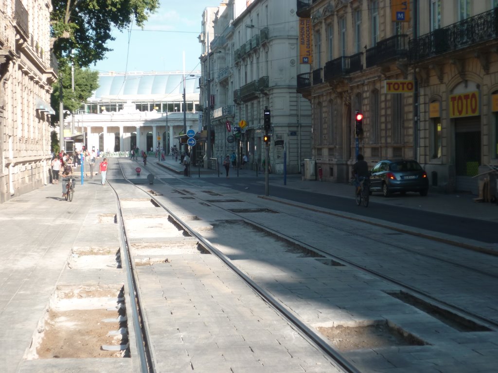 Rue de la République à Montpellier, des dalles de pierre détériorées par le passage régulier de véhicules automobiles sur la plateforme des voies communes aux lignes 3 et 4 de tramway ont été retirées en plusieurs endroits, le lundi 15 juin 2015. Copyright : Edouard Paris