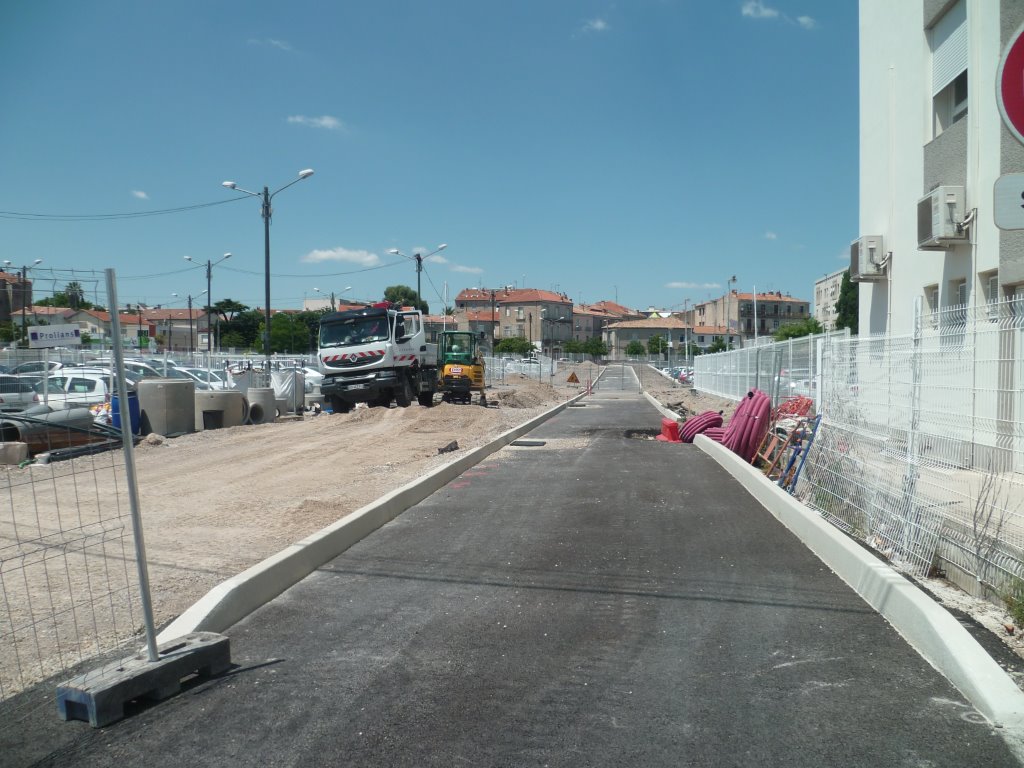 Voie de sortie unique vers l’avenue de Maurin depuis le parking Saint-Roch. Le mercredi 17 juin 2015, la voie d’accès au parking Saint-Roch depuis l’avenue de Maurin n’était pas encore achevée. Copyright : Edouard Paris