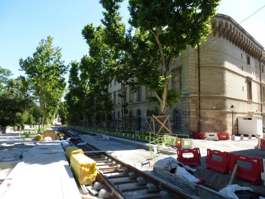 Boulevard Henri IV à Montpellier, où les rails de la voie montante ont été soudés. Photo prise le samedi 20 juin 2015. Copyright : Louis Ferdinand