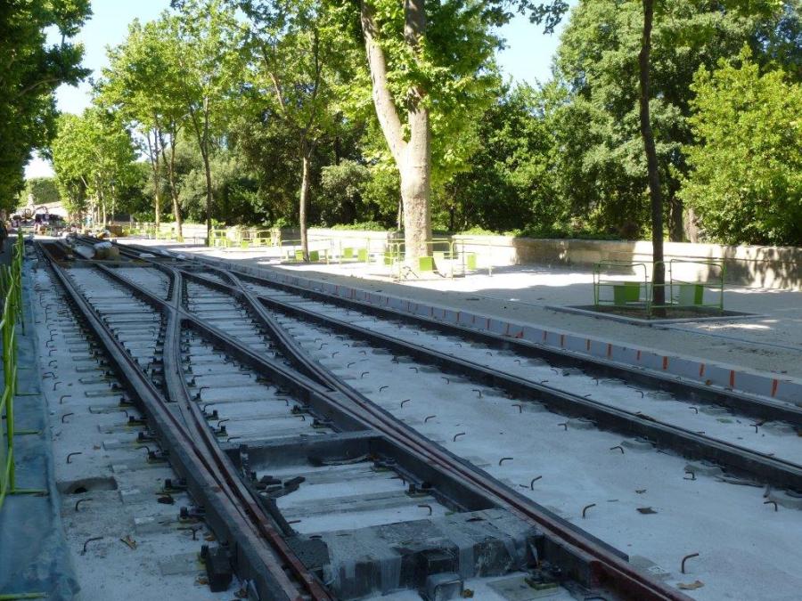 Boulevard Henri IV à Montpellier, les appareils de voie, installés entre la Tour des Pins et la rue de l’Ecole de Médecine, sont désormais figés par le béton de blocage qui a été coulé en milieu de semaine. Photo prise le samedi 20 juin 2015. Copyright : Louis Ferdinand