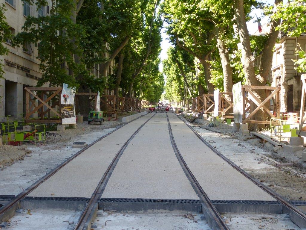 Au bas du boulevard Henri IV à Montpellier, la plateforme du tramway est recouverte de béton désactivé. Photo prise le samedi 20 juin 2015. Copyright : Louis Ferdinand