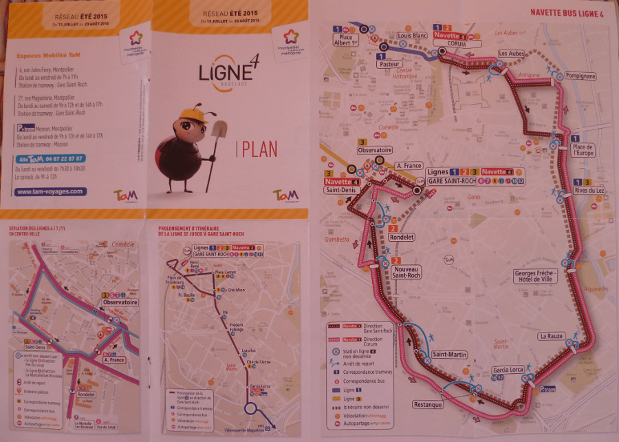 Déviation des lignes de bus 6, 7 et 11 en centre-ville, prolongement d’itinéraire de la ligne de bus 32 jusqu’à la gare Saint-Roch et navette bus ligne 4 du lundi 13 juillet au dimanche 23 août 2015. Document : TaM Montpellier 3M (26/06/2015)