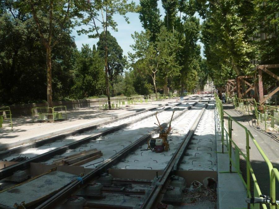 Boulevard Henri IV à Montpellier, au tout premier plan dans l’ombre, l’absence de soudures est signalée par deux embouts placés entre deux rails, l’un de couleur bleu, le second de couleur grise. Photo prise le vendredi 26 juin 2015. Copyright : Edouard Paris