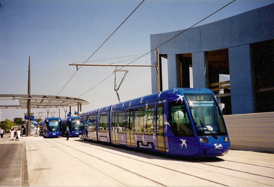 Le vendredi 30 juin 2000, au terminus « Odysseum » (aujourd’hui station « Place de France »), les six rames Citadis 301 Alstom attendent les invités à l’inauguration de la ligne 1 de tramway. Copyright : Michel Bozzola