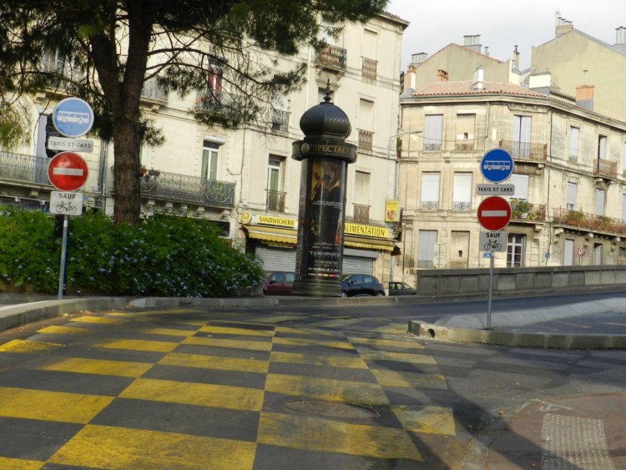 Marquage au sol et panneaux indiquant que la voie, située côté droit, menant au Pont-de-Sète et au-delà, est réservée aux seuls bus, cars, taxis et vélos, depuis le boulevard de Strasbourg. Photo prise le mercredi 1er juillet 2015. Copyright : Edouard Paris