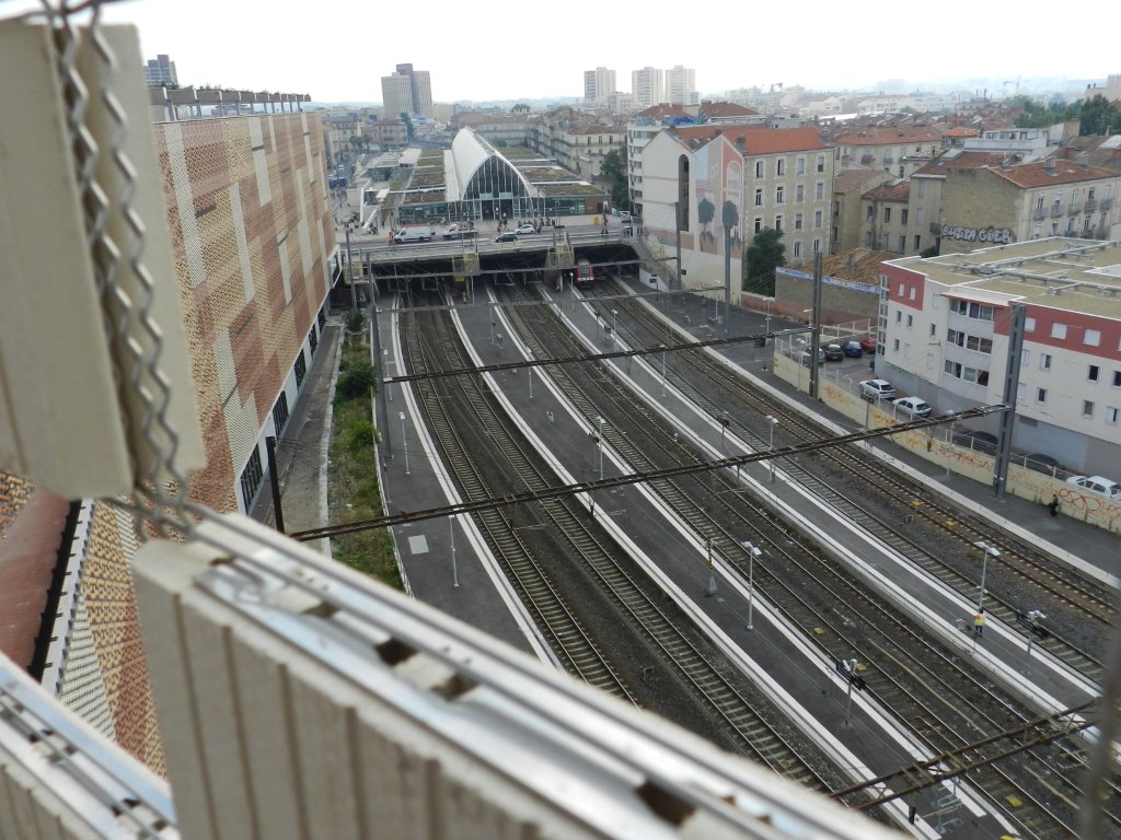 Certainement une des premières photos des voies ferrées et de la gare Saint-Roch prises depuis un des points les plus élevés du parking Saint-Roch, le mercredi 1er juillet 2015, jour de sa mise en service. Copyright : Anje34