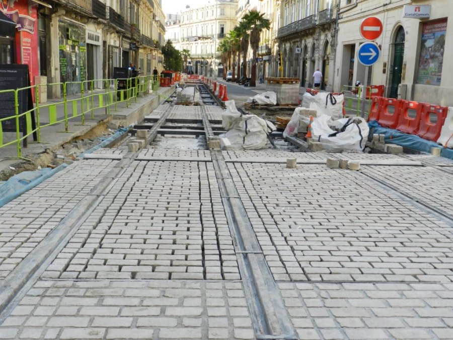 Vue plus détaillée des pavés posés sur le boulevard du Jeu-de-Paume à la hauteur de la rue Marceau. Photo prise le samedi 4 Juillet 2015. Copyright : Anje34