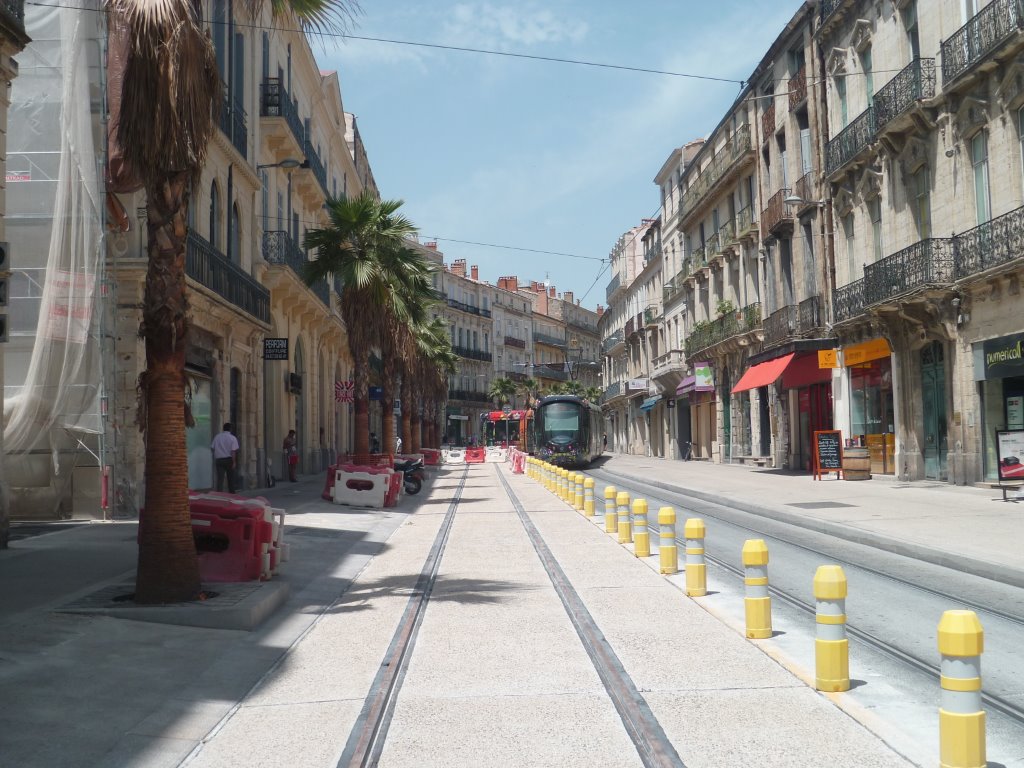 Exemple d’un revêtement constitué de béton désactivé sur le boulevard du Jeu-de-Paume à Montpellier. Ici la future voie descendante de la ligne 4 entre la rue André-Michel et la place Edouard-Adam. Photo prise le vendredi 3 juillet 2015. Copyright : Edouard Paris
