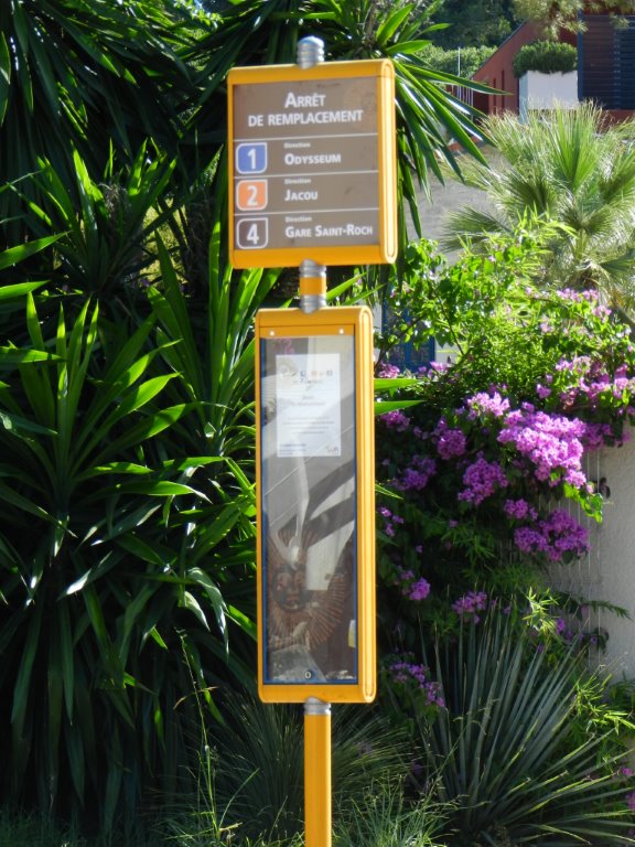 Totem de l’arrêt « Corum » de la navette bus ligne 4 qui circulera du lundi 13 juillet au dimanche 23 août 2014. Photo prise le jeudi 9 juillet 2015. Copyright : Anje34