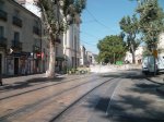 - Dans le bas du boulevard du Jeu-de-Paume à Montpellier, un aiguillage talonnable va être installé sur l’actuelle voie montante commune aux lignes 3 et 4 de tramway afin de permettre à des rames venant de la rue du Faubourg-de-la-Saunerie de remonter le boulevard du Jeu-de-Paume soit en direction de la place Albert 1er, soit en direction de la rue André-Michel. Photo prise le samedi 11juillet 2015. Copyright : Edouard Paris