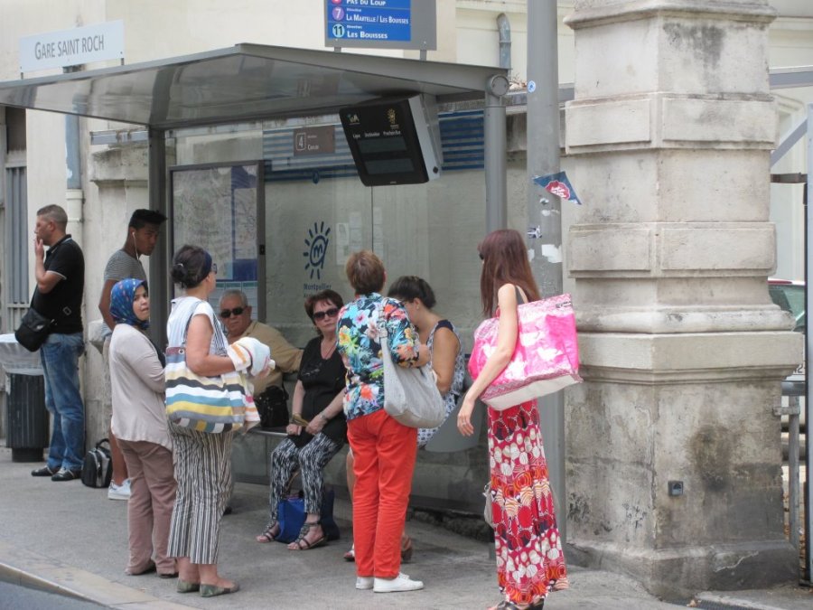 Rue Pagézy à Montpellier, signalétique insuffisante au terminus « Gare Saint-Roch » de la navette bus ligne 4 qui remplace les rames de tramway du 13 juillet au 23 août 2015. Photo prise le lundi 13 juillet 2015. Copyright : Edouard Paris