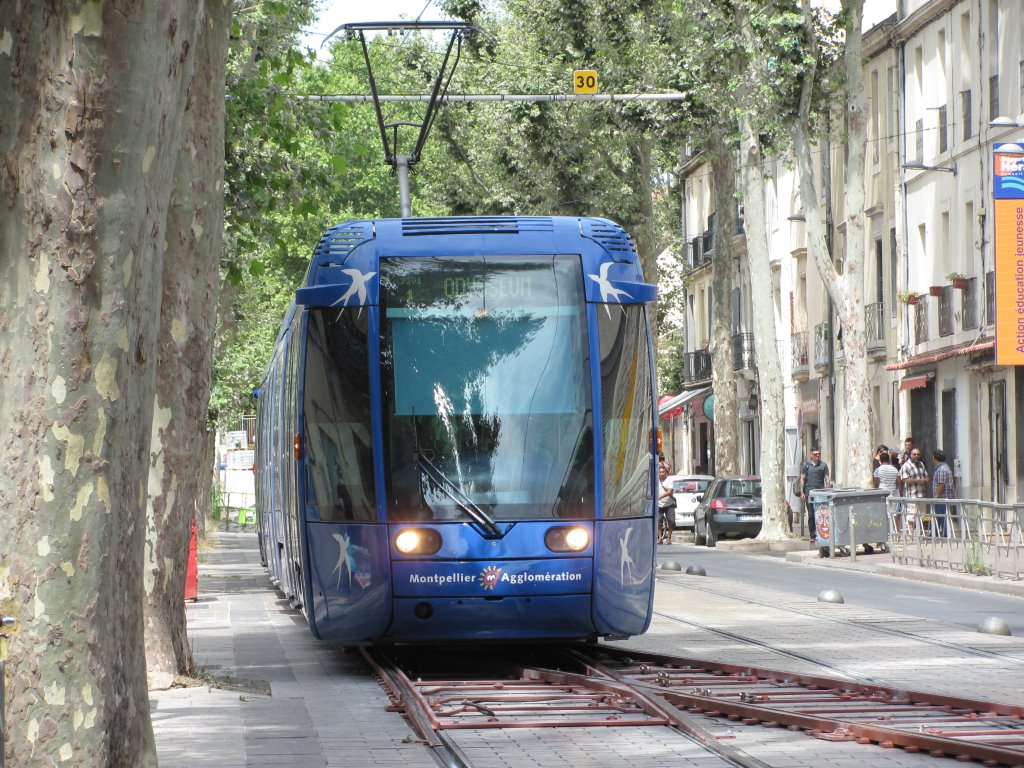 Tout de suite après avoir quitté le terminus provisoire « Pasteur », la rame 2020 Citadis 401 Alstom franchit en ligne droite à 5 km/h au maximum l’aiguillage californien qui autorise les rames arrivant d’Odysseum de venir se positionner à gauche du quai unique de ce terminus provisoire « Pasteur ». Photo prise le lundi 13 juillet 2015. Copyright : Edouard Paris