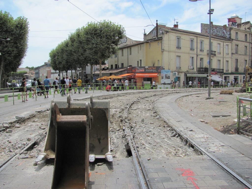 Entre les terminus provisoires « Place Albert 1er » et « Pasteur », le cheminement piétonnier longe les voies communes aux lignes 1 et 4 amenées à être remplacées au niveau de la place Albert 1er. Photo prise le lundi 13 juillet 2015. Copyright : Edouard Paris