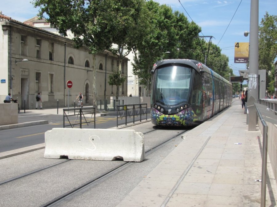 Dans le bas du cours Gambetta à Montpellier, la rame 2078 Citadis 402 Alstom arrive au terminus provisoire « Saint-Denis », le lundi 13 juillet 2015. Copyright : Edouard Paris