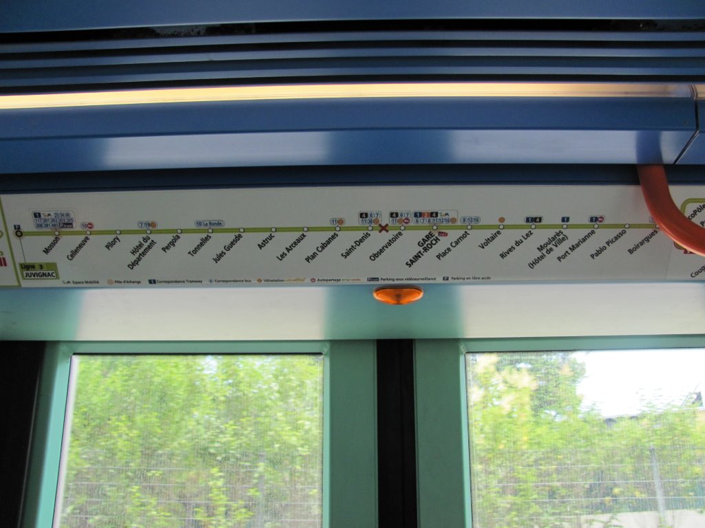 Dans les rames de la ligne 3, sur le « thermomètre » annonçant l’ensemble des stations de cette même ligne, une croix de Saint-André indique que la ligne 3 est coupée entre les stations « Saint-Denis » et « Observatoire ». Photo prise le lundi 13 Juillet 2015. Copyright : Edouard Paris