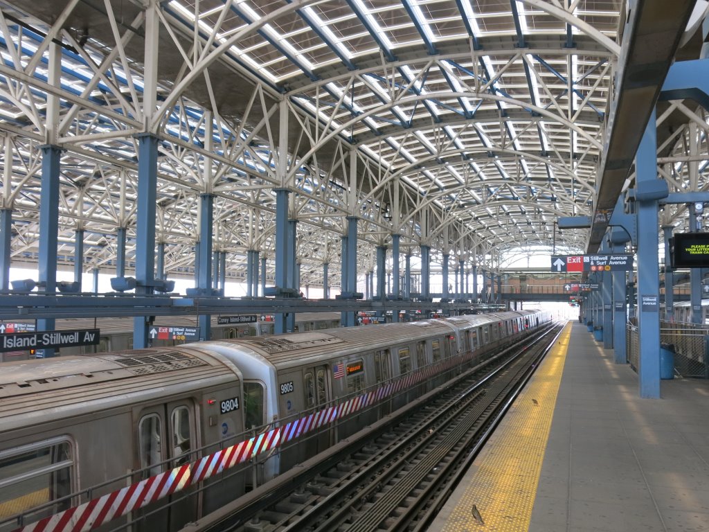 Vue partielle de l’immense marquise équipée de 7.100 m² de panneaux photovoltaïques du terminal « Coney Island – Stillwell Avenue ». Photo prise le mercredi 27 mai 2015. Copyright : Edgar Chaptal