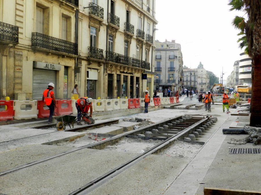 Au bas du boulevard du Jeu-de-Paume à Montpellier, il sera installé une traversée sur la voie descendante en direction du boulevard de l’Observatoire et un aiguillage talonnable sur la voie montante commune aux lignes 3 et 4 de tramway. Photo prise le jeudi 16 juillet 2015. Copyright : Anje34