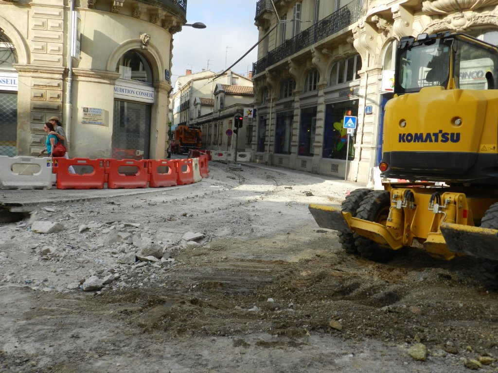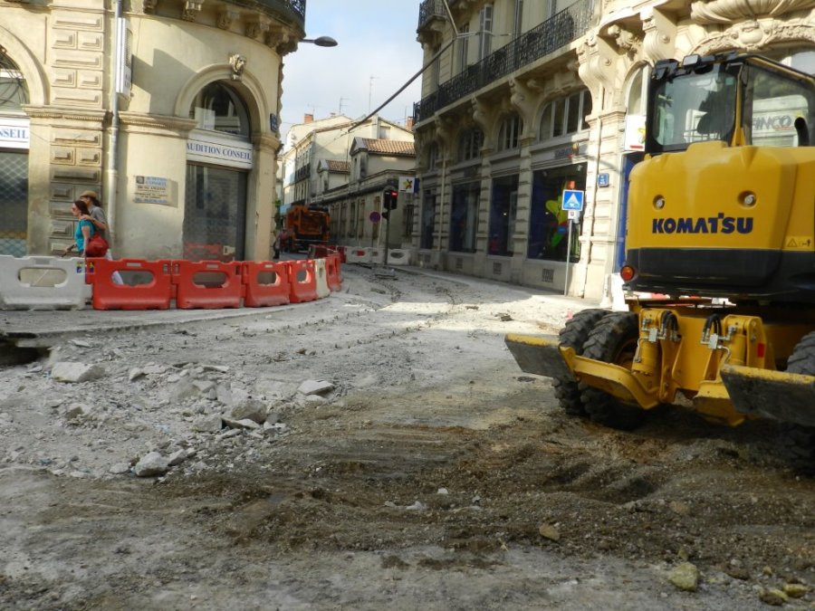 Les rails de la courbe conduisant les rames des lignes 3 et 4 de tramway en direction du cours Gambetta par la rue André-Michel ont été enlevés. La nouvelle courbe comprendra deux appareils de voie appelés traversées. Photo prises le jeudi 16 Juillet 2015. Copyright : Anje34