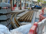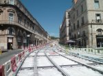 - Même bifurcation de la place Edouard-Adam à Montpellier, photographiée le vendredi 24 juillet 2015. Deux coupons de rails en courbe ont été remplacés. Copyright : Edouard Paris