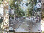 - Photographie du rendu montrant la future configuration du boulevard Henri IV à Montpellier après mise en service du chaînon manquant de la ligne 4 de tramway. On remarque qu’un véhicule automobile remonte le boulevard sur la voie revêtue de béton désactivé. Photo prise le samedi 11 juillet 2015. Copyright : Edouard Paris