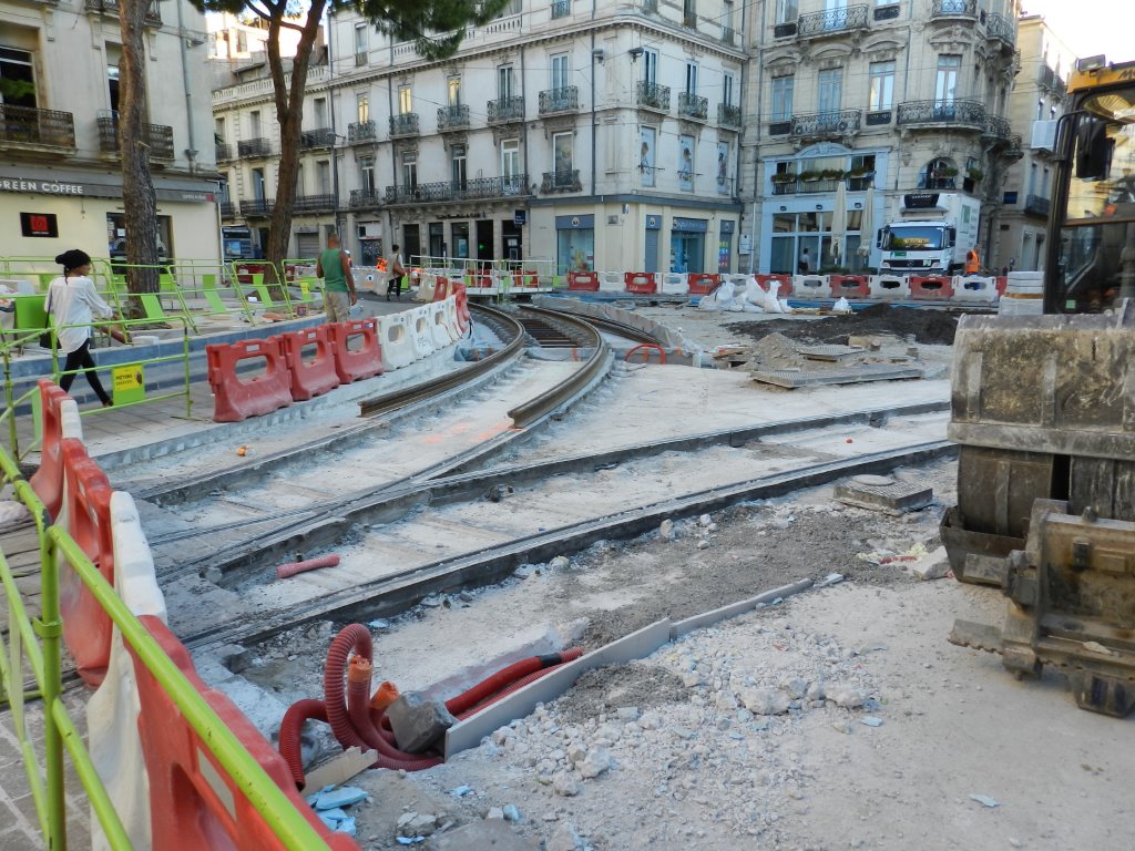 Photographie de la bifurcation de la place Edouard-Adam à Montpellier, le jeudi 23 Juillet 2015. Deux coupons de rails en courbe vont être démontés. Copyright : Anje34