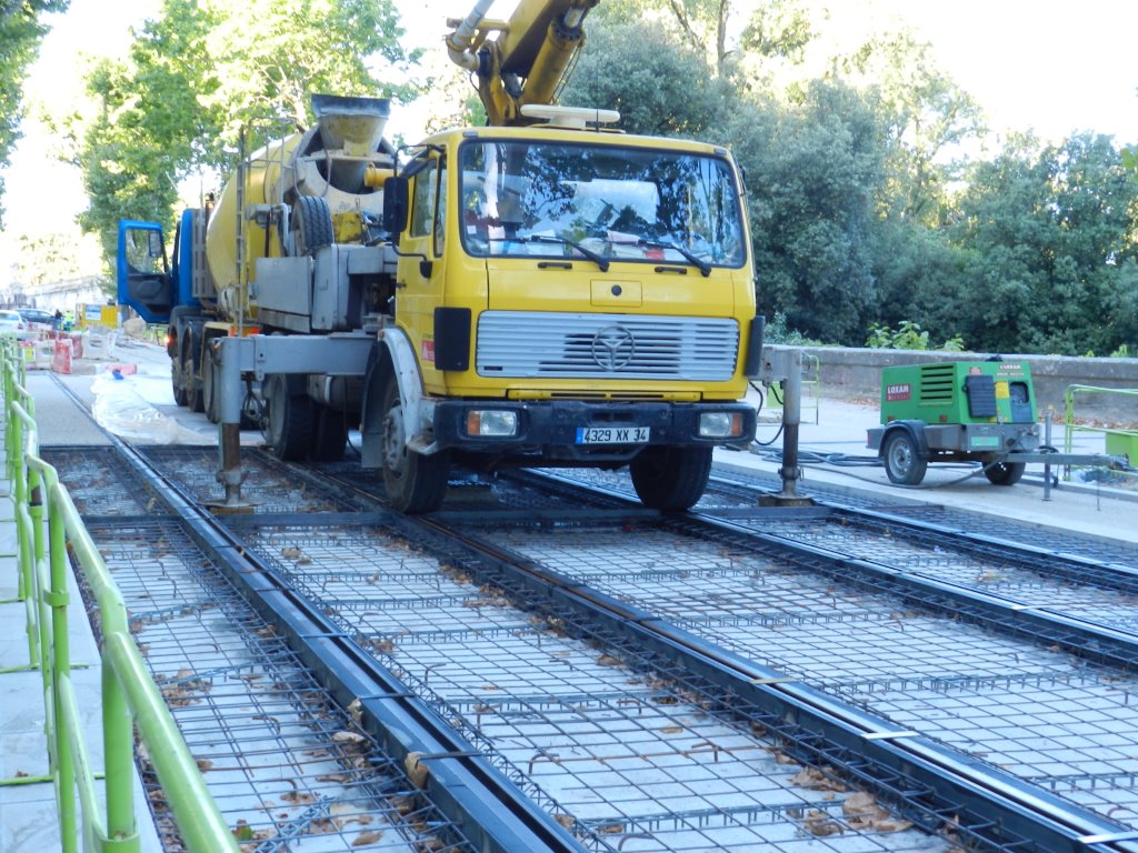Engins routiers en train de procéder au coulage du béton désactivé entre les rails posés sur le boulevard Henri IV à la hauteur du Jardin des Plantes, le jeudi 23 juillet 2015. Copyright : Anje34