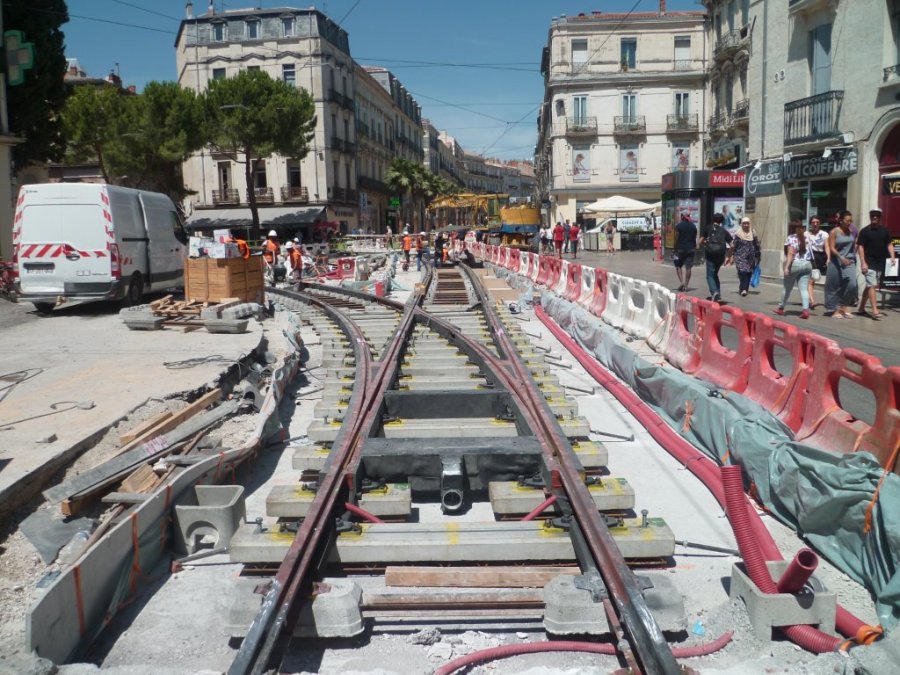 Boulevard de l’Observatoire à Montpellier, au premier plan de la photo prise le vendredi 24 juillet 2015, le nouvel appareil de voie devant assurer la connexion entre la voie unique venant de la rue du Faubourg-de-la-Saunerie et la future voie descendante de la ligne 4. Copyright : Edouard Paris