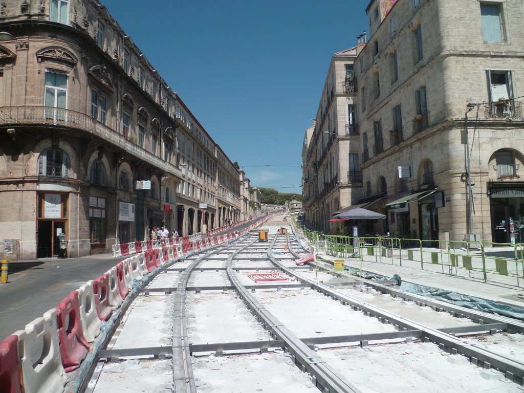 Vue du boulevard Ledru-Rollin à Montpellier depuis l’intersection du boulevard du Jeu-de-Paume, de la rue Saint-Guillhem et de la rue du Faubourg-du-Courreau, le vendredi 24 juillet 2015. Copyright : Edouard Paris