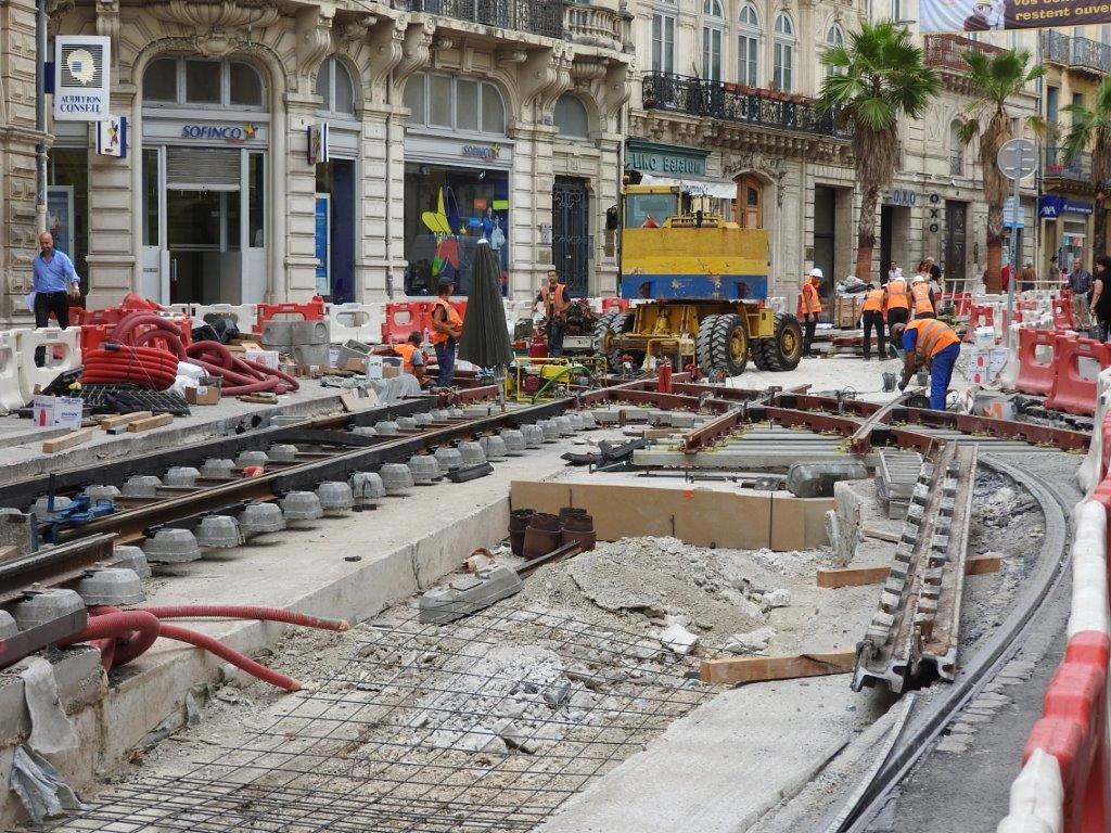 Installation des appareils de voie nommés traversées, boulevard du Jeu-de-Paume, à la hauteur de la rue André-Michel, le jeudi 30 juillet 2015. Copyright : Anje34