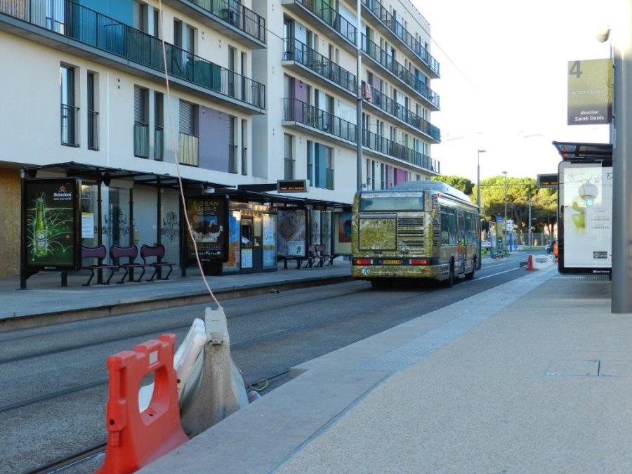 Dans le sens « Corum » – « Gare Saint-Roch », la navette bus, qui remplace les rames de la ligne 4 de tramway du lundi 13 Juillet au dimanche 23 août 2015, longe sans s’arrêter le quai direction « Saint-Denis » de la station « Garcia Lorca ». Photo prise le mardi 28 juillet 2015. Copyright : Anje34