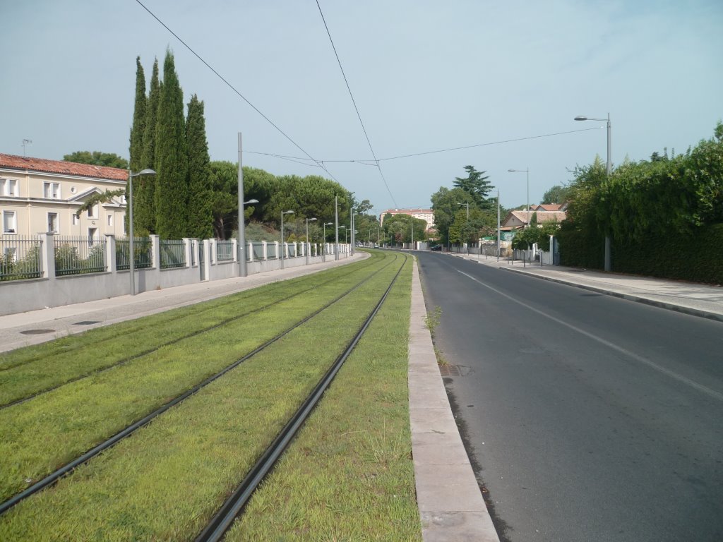 Plateforme engazonnée de la ligne 3 de tramway, avenue de Lodève à Montpellier, entre les stations « Tonnelles » et « Jules Guesde », photographiée le samedi 8 août 2015. Copyright : Edouard Paris