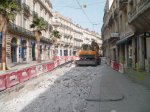 - Destruction du revêtement actuel de la voie 1 commune aux lignes 3 et 4 de tramway au marteau piqueur hydraulique, dans le bruit et la poussière, place Edouard-Adam à Montpellier, le samedi 8 août 2015. Copyright : Edouard Paris