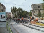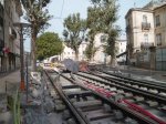 - Sur le boulevard du Jeu-de-Paume à Montpellier, des rails de la voie commune aux lignes 3 et 4 ont été enlevés pour laisser la place dans un futur très proche à un appareil de voie. Photo prise le samedi 8 août 2015. Copyright : Edouard Paris