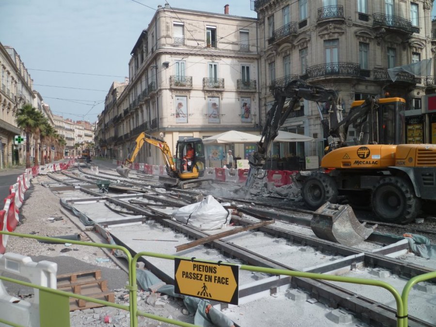 Destruction du revêtement actuel de la voie 1 commune aux lignes 3 et 4 de tramway au marteau piqueur hydraulique, dans le bruit et la poussière, place Edouard-Adam à Montpellier, le samedi 8 août 2015. Copyright : Edouard Paris