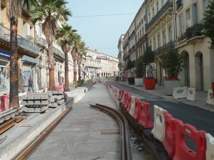 Boulevard du Jeu-de-Paume à Montpellier, entre la rue André-Michel et la rue Marceau, le samedi 8 août 2015. Les bus des lignes 6, 7 et 11 empruntent la plateforme de la voie montante du tramway située à droite. Photo prise le samedi 8 août 2015. Copyright : Edouard Paris