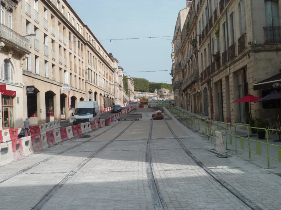 Photographie du boulevard Ledru-Rollin à Montpellier prise le samedi 8 août 2015. Pavés au premier plan et béton désactivé à la suite sont les principaux revêtements de la plateforme du tramway. Copyright : Edouard Paris