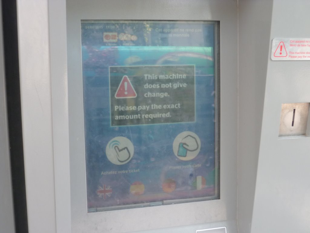 Depuis une semaine, il est préférable de payer par carte bancaire (attention, elles ne sont pas toutes acceptées) pour acheter son titre de transport aux distributeurs automatiques installés dans les stations de tramway. Un règlement en espèce nécessite obligatoirement l’appoint. Photo prise à la station « Plan Cabanes », le vendredi 14 août 2015. Copyright : Edouard Paris