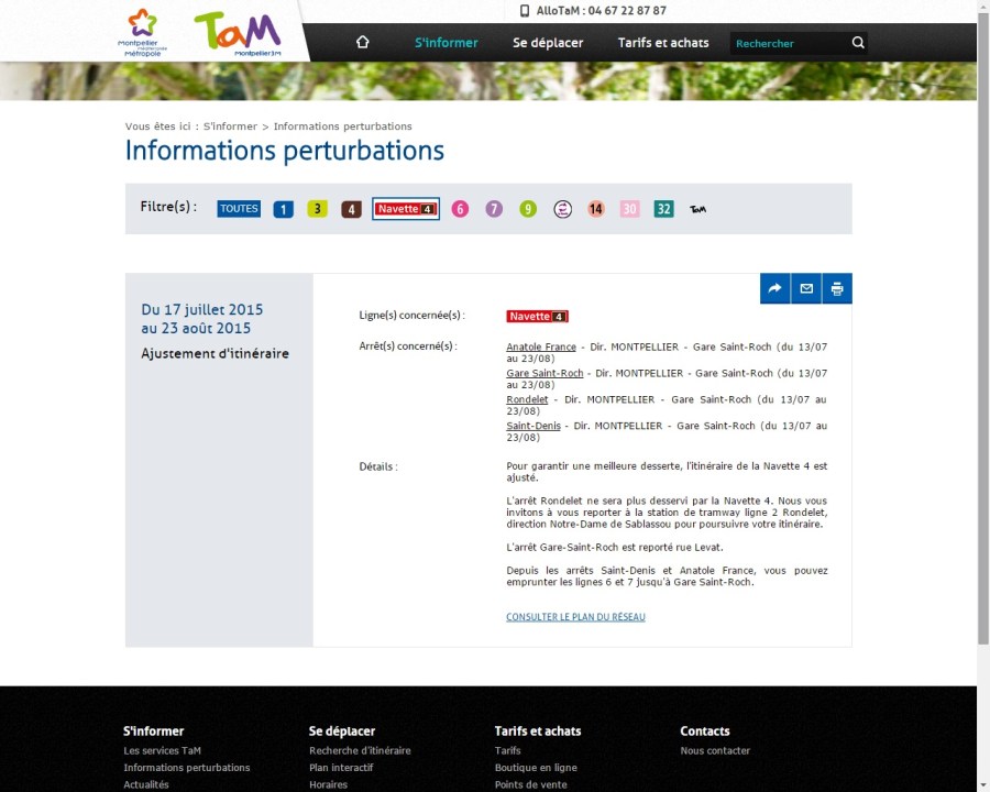 Information sur le site TaM Voyages portant sur l’ajustement de l’itinéraire de la navette ligne 4 à compter du vendredi 17 juillet 2015, dans le sens « Corum » – « Gare Saint-Roch ». Document : TaM