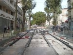 - Boulevard de l’Observatoire à Montpellier, le revêtement de la plateforme du tramway devra être impérativement posé d’ici au dimanche 23 août 2015 au plus tard. Photo prise le samedi 15 août 2015. Copyright : Edouard Paris