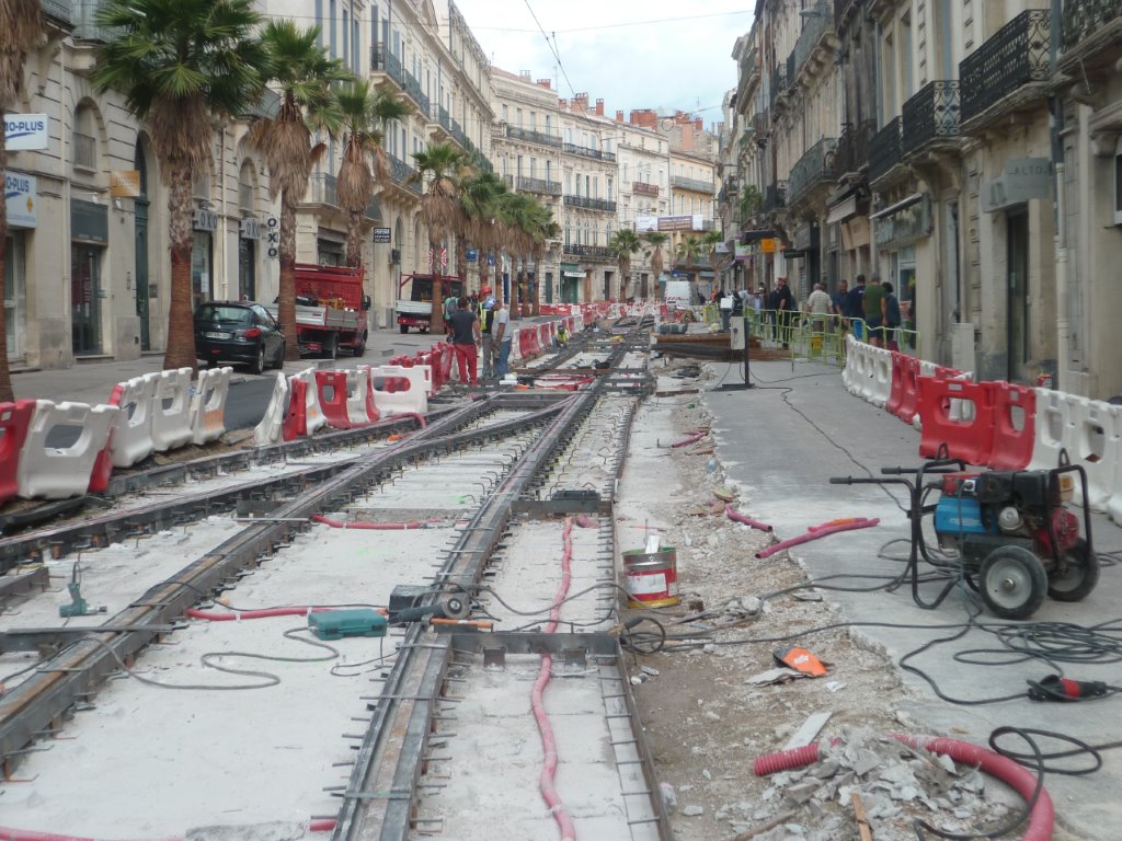 Boulevard du Jeu-de-Paume à Montpellier, entre la place Edouard-Adam et la rue André-Michel, la plateforme de la voie montante commune aux lignes 1 et 4 doit être principalement revêtue de béton désactivé d’ici au dimanche 23 août 2015 au plus tard. Photo prise le samedi 15 août 2015. Copyright : Edouard Paris