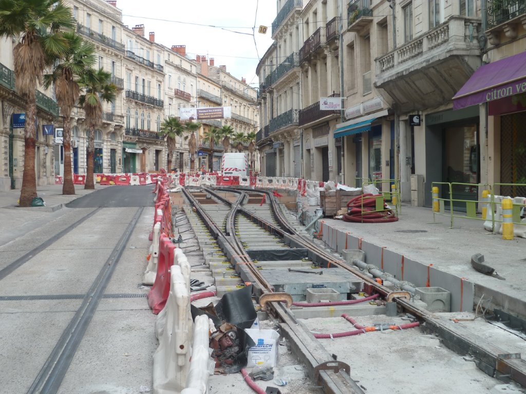 Le dernier appareil de voie indispensable à la reprise de la circulation normale des rames des lignes 3 et 4 en direction du cours Gambetta a été installé durant la semaine 33 de l’année 2015, boulevard du Jeu-de-Paume. Photo prise le samedi 15 août 2015. Copyright : Edouard Paris