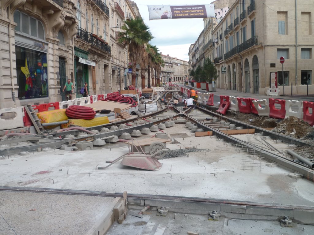 Le fonctionnement de l’appareil de voie, qui orientera dans le futur les rames qui descendront le boulevard du Jeu-de-Paume tant vers le boulevard de l’Observatoire que vers la rue André-Michel, ne sera pas indispensable pour la reprise de la circulation des rames des lignes 3 et 4 sur le secteur Jeu-de-Paume – Gambetta – Saint-Denis, le lundi 24 août 2015. Photo prise le samedi 15 août 2015. Copyright : Edouard Paris