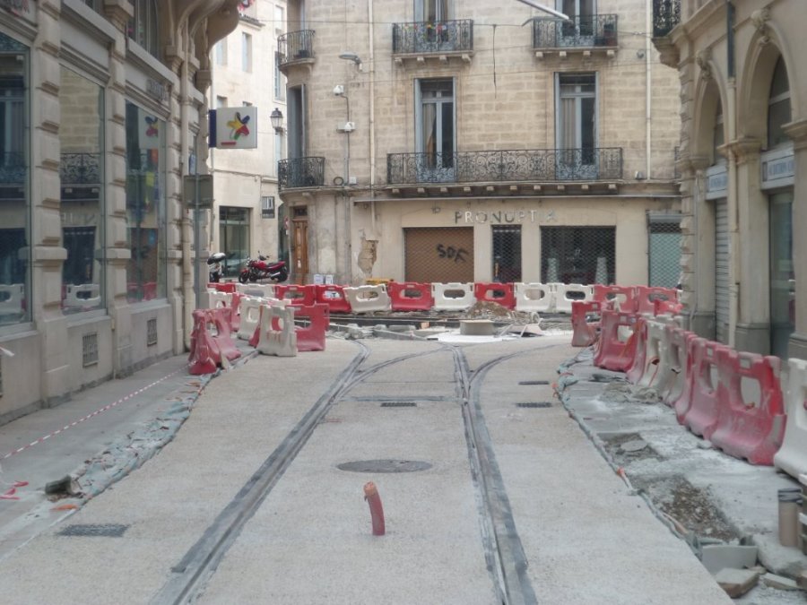 Rue André-Michel à Montpellier, le béton désactivé a été coulé entre les rails de l’appareil de voie installé au cours des travaux d’été 2015 programmés entre le lundi 13 juillet et le dimanche 23 août 2015. Photo prise le samedi 15 août 2015. Copyright : Edouard Paris
