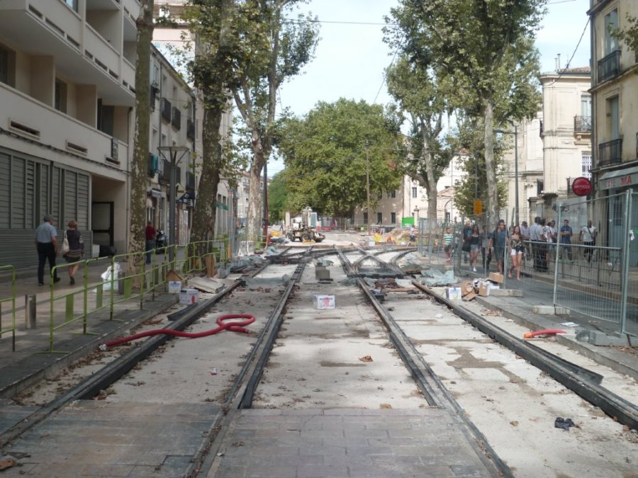 A la limite du boulevard Pasteur et de la place Albert 1er, les trois appareils de voie, soit deux aiguillages et une traversée ont été installés, mais il reste beaucoup à faire d’ici au dimanche 23 août 2015 au soir. Photo prise le samedi 15 août 2015. Copyright : Edouard Paris