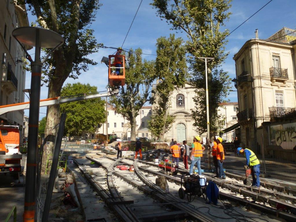 Place Albert 1er à Montpellier, à la limite avec le boulevard Pasteur, des équipes s’affairent tant sur les voies que sur la ligne aérienne de contact qui doivent être opérationnelles le lundi 24 août 2015 dès la prise de service au petit matin. Photo prise le mardi 18 août 2015. Copyright : Louis Ferdinand