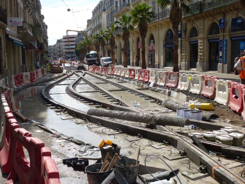 Le matin du mardi 18 août 2015, c’est du béton de blocage qui a été coulé à la hauteur de l’appareil de voie qui orientera les rames de tramway tant vers la rue André-Michel que tout droit en direction du haut du boulevard du Jeu-de-Paume. Photo prise le mardi 18 août 2015. Copyright : Louis Ferdinand